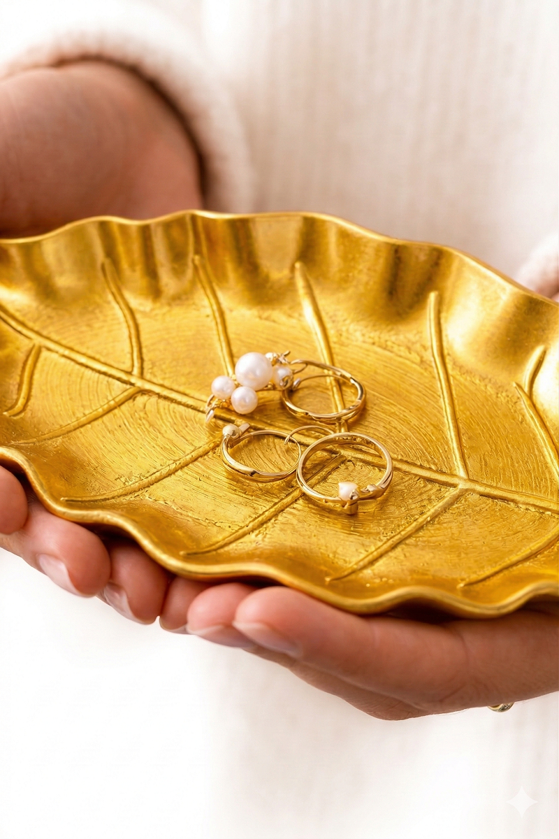 A bandeja decorativa em formato de folha dourada é perfeita para organizar joias, anéis, brincos e pequenos objetos com charme e sofisticação. Ideal para penteadeiras, mesas de cabeceira, aparadores e racks, ela une funcionalidade e decoração em uma única peça.