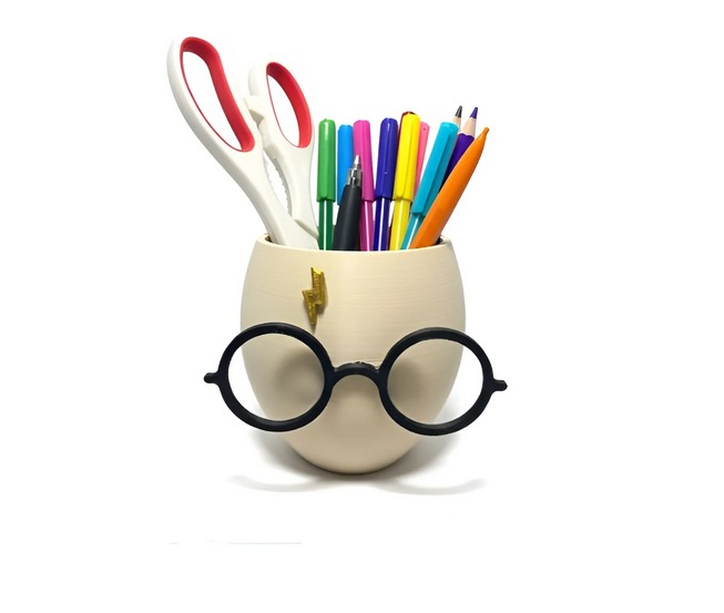 O Porta Caneta Geek Raio e Óculos é produzido em impressão 3D com termoplástico resistente, trazendo um design moderno e criativo inspirado no universo bruxo.